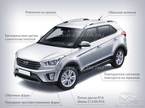 Базовая комплектация авто называется Creta Start. Такая машина появится с 123-сильным двигателем на 123 «лошадки», а выбрать можно 2 КПП: «механика» или «автомат». Стоимость авто с МКП равна 825 тысячам рублей, а паркетник с «атвоматом» будет стоить от 860 тысяч рублей. Базовая машина порадует кондиционером, а также фронтальными подушками безопасности.