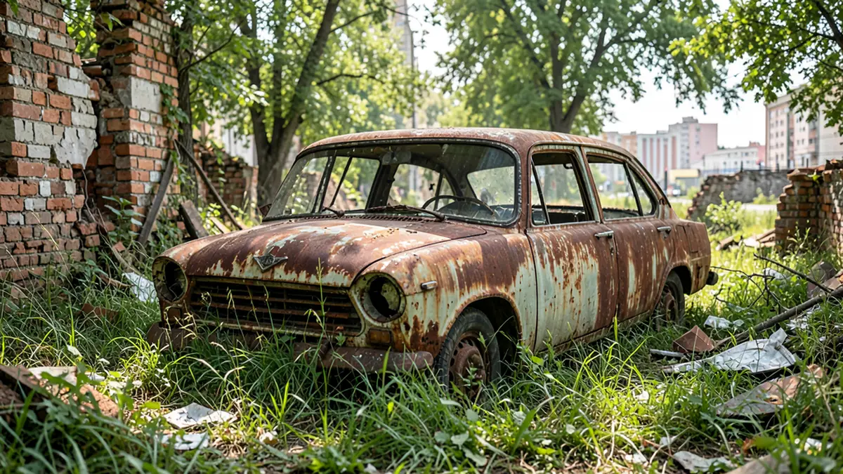 - Автомобиль сильно повреждён и покрыт ржавчиной.